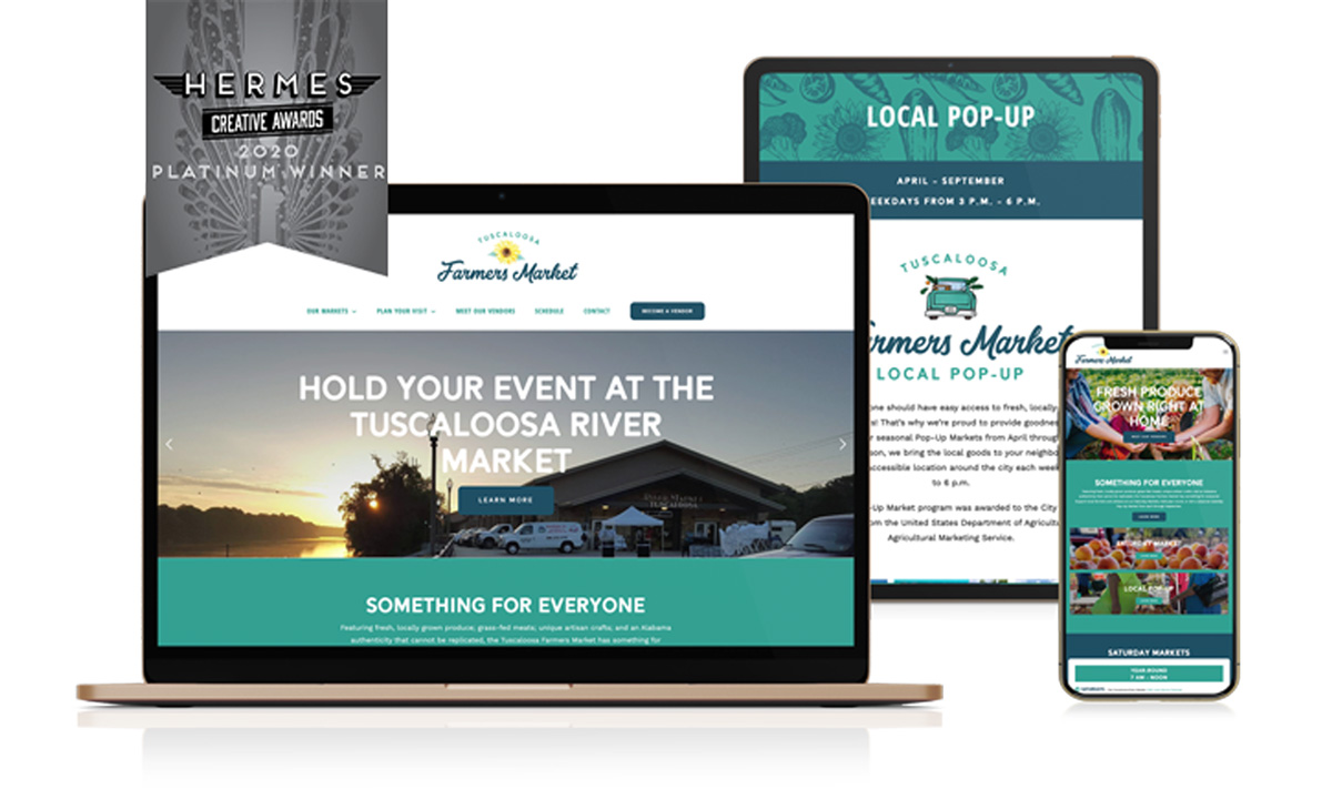 We also created the brand identity and website for the Tuscaloosa Farmers Market, housed at the Tuscaloosa River Market along the Black Warrior River. With more than 60 vendors offering Alabama-grown produce, baked goods, meats, and artisan products, the market needed a modern, approachable brand that reflected its role as a year-round community hub.